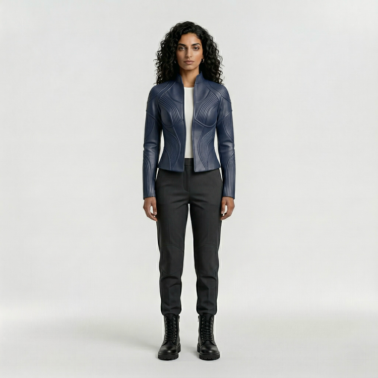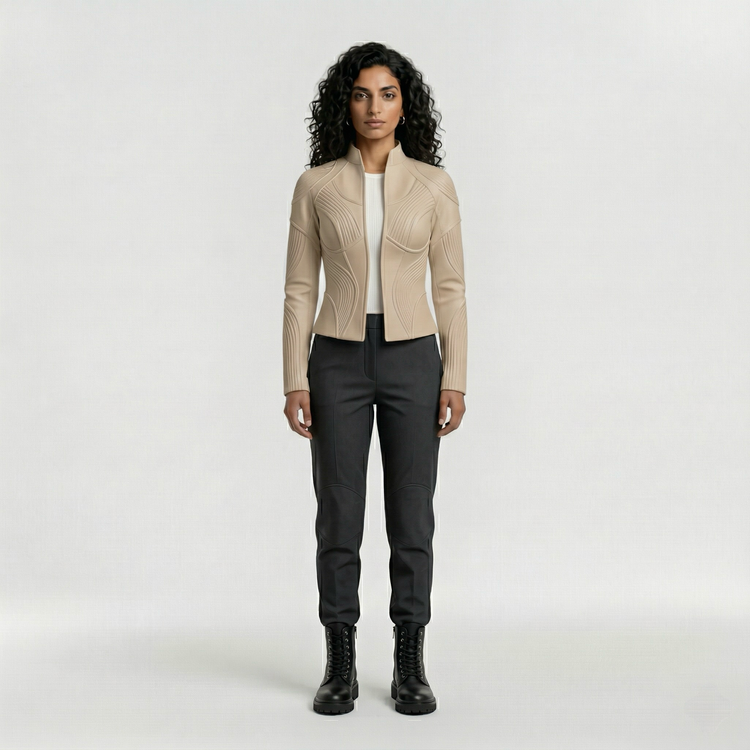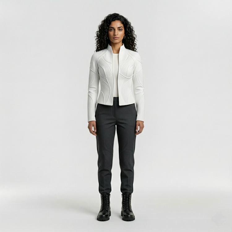 This sculpted contour panel jacket delivers a refined, futuristic aesthetic through its fluid, curved panel construction. Designed to follow the natural lines of the body, the jacket creates a flattering, contoured silhouette while maintaining a sharp, structured feel.